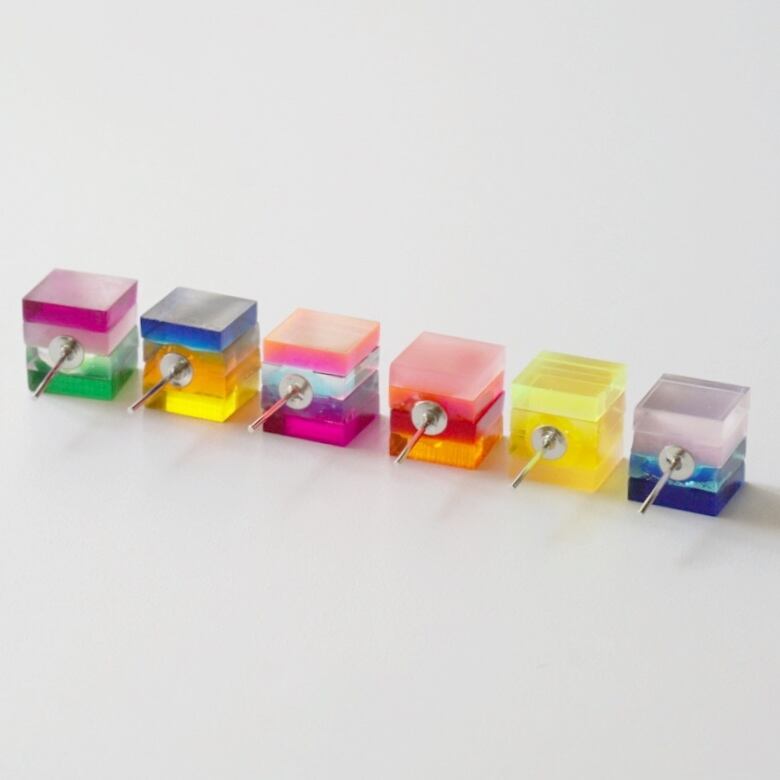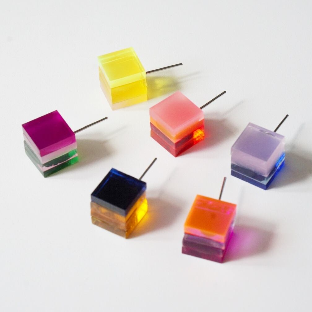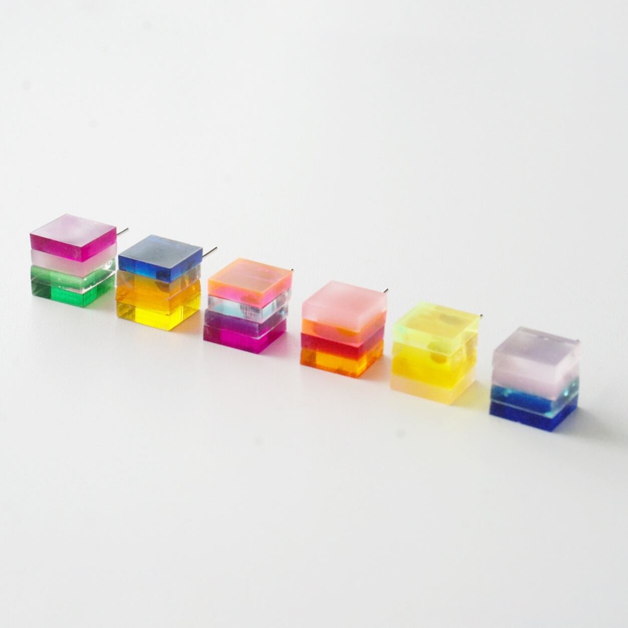 子どもの頃に食べたカラフルなキャンディを彷彿とさせる、遊び心のあるピアスです。異なる色のアクリルを重ね合わせ、ひとつひとつ手作業で貼り合わせて制作しました。シンプルな装いにも、カラフルなお洋服にも。片耳分ずつの販売ですので、左右でお好きな色を組み合わせてお楽しみください。(もちろん両耳同じ色を選んでもOK。)アクリルなので軽やかな素材感で、つけ心地も快適。デイリールックのアクセントに最適です。金属アレルギーの方にも安心なステンレス製ポストです(全ての方にアレルギーが起きないわけではありません)。
