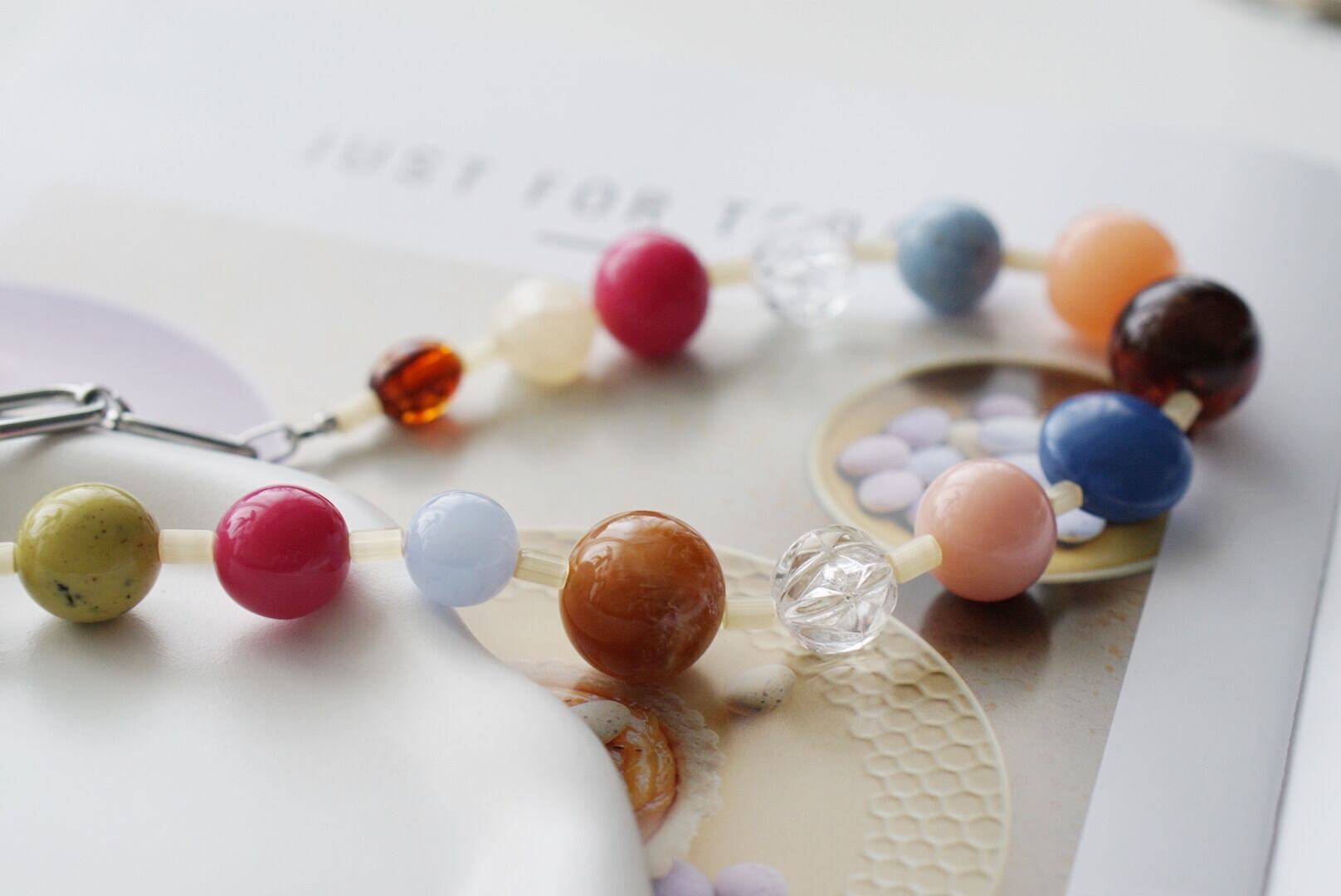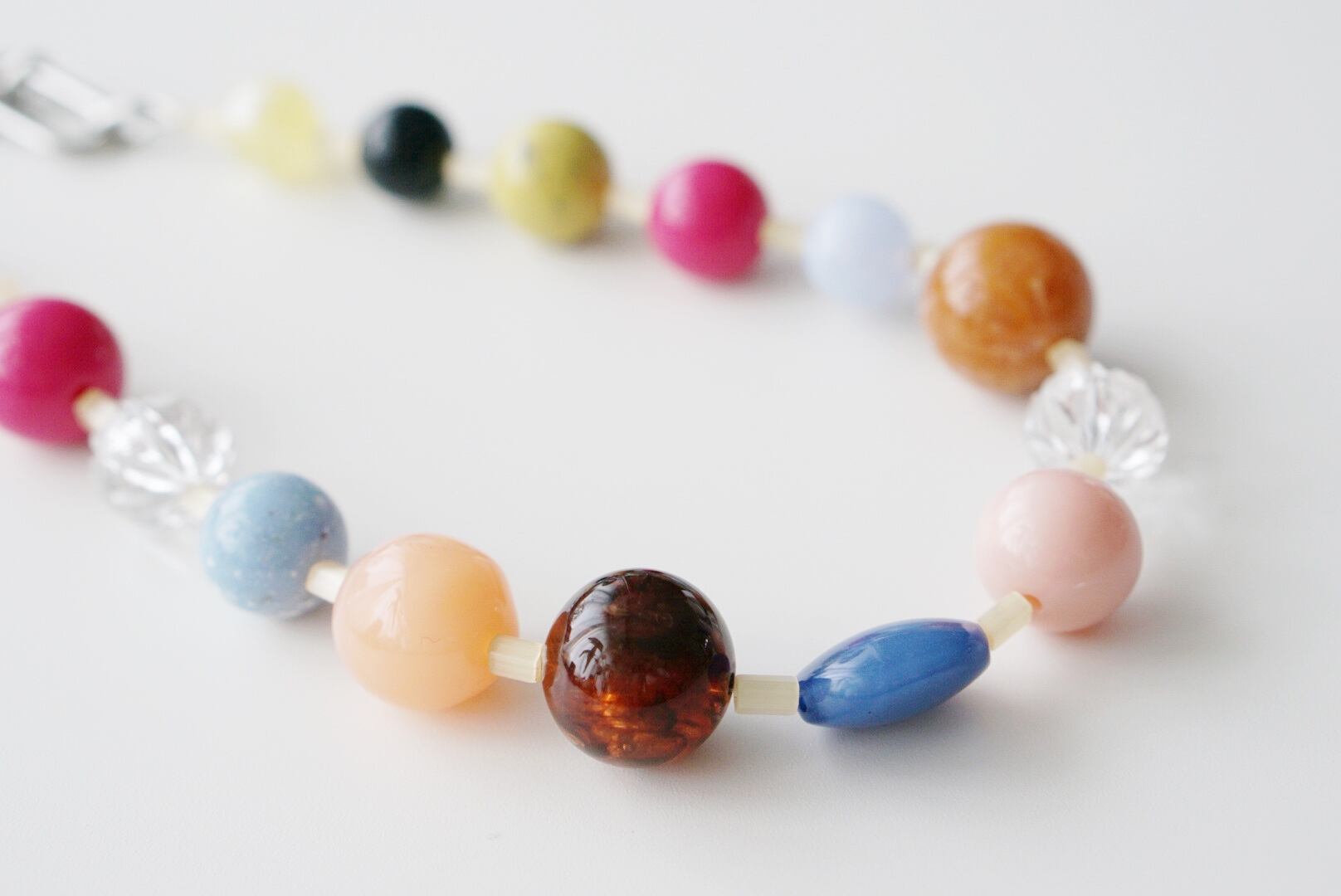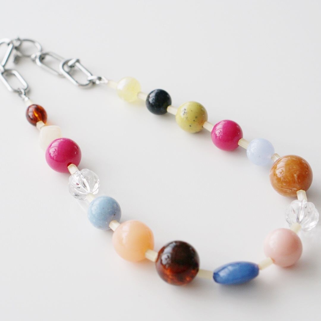 アクリル製のカラフルなビーズをメイン使用した、鮮やかでポップなネックレス。ボリューミーな見た目に反して軽やかな着け心地です。シンプルなスタイルにこれ一本を合わせるだけで個性的なルックが完成。鮮やかなベリーピンクがアクセント。お揃いのブレスレットのご用意もございます。