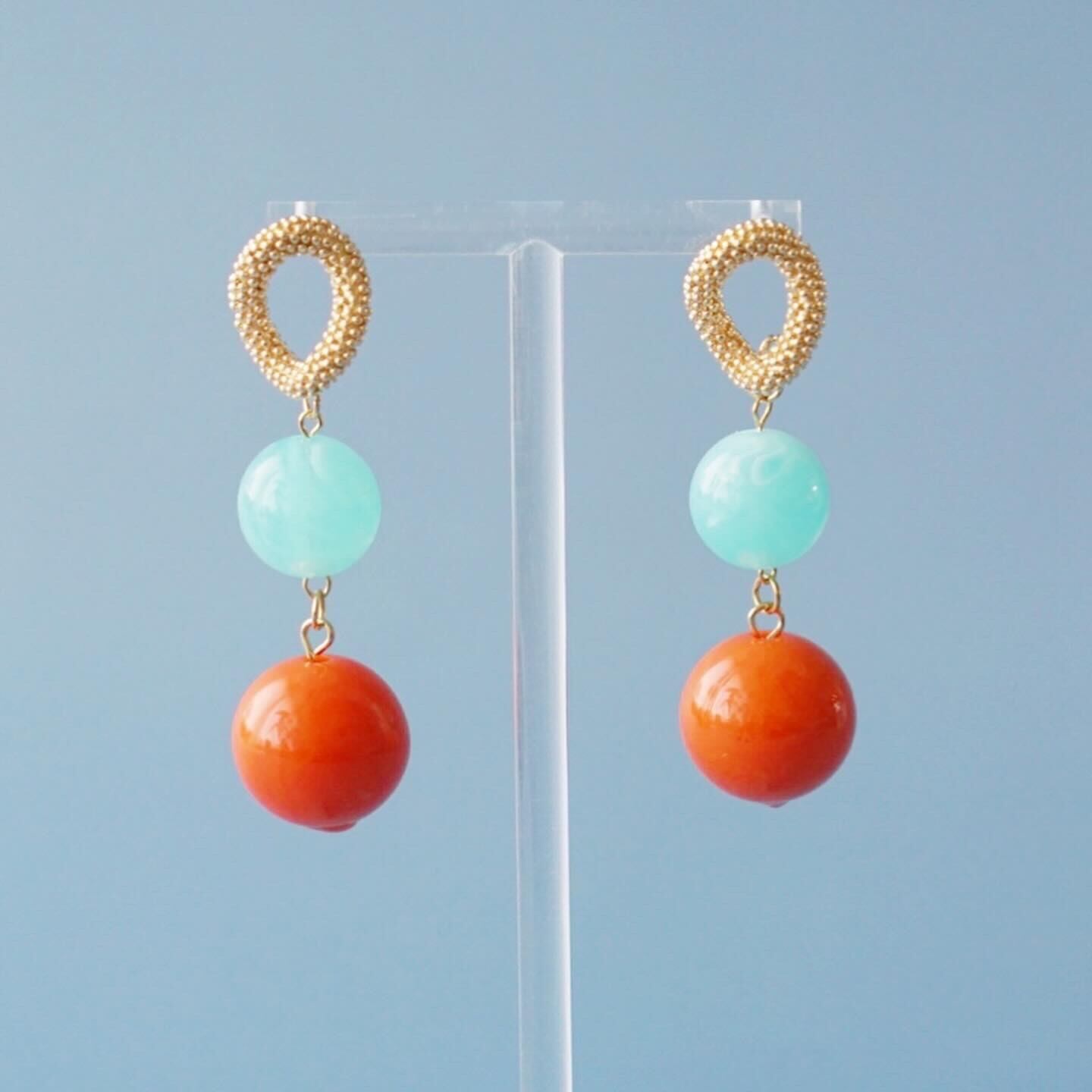 粒々とした不思議な模様の輪っかと、軽やかなアクリルビーズのピアスです。肌に接する部分の金属はk18ゴールドフィルドです。大ぶりなビーズで顔周りをパッと明るい印象にし、ビビットなオレンジが元気で前向きな気持ちにしてくれます。