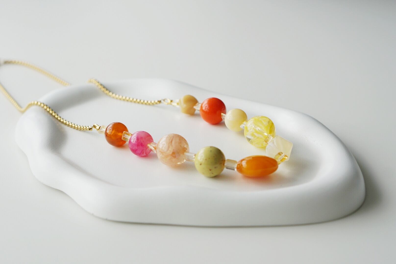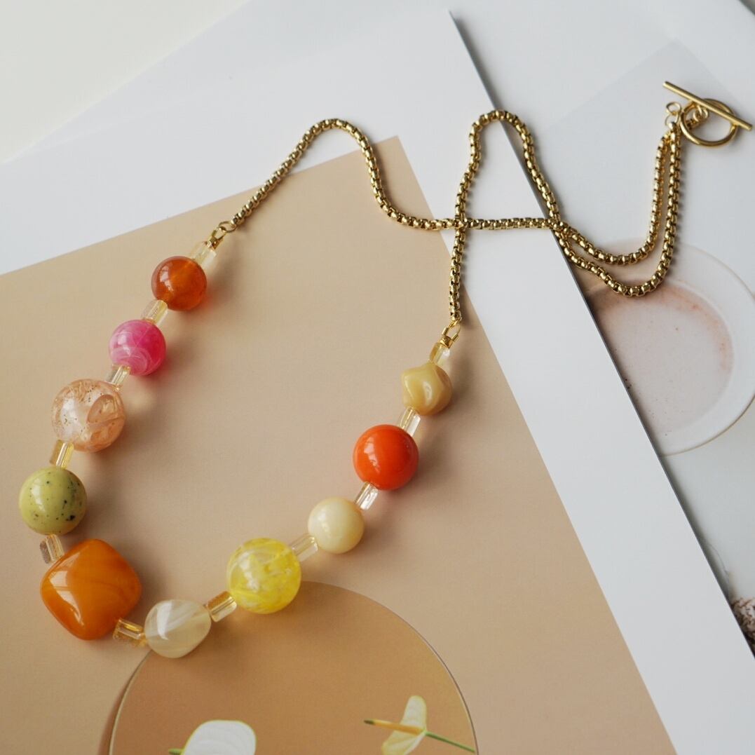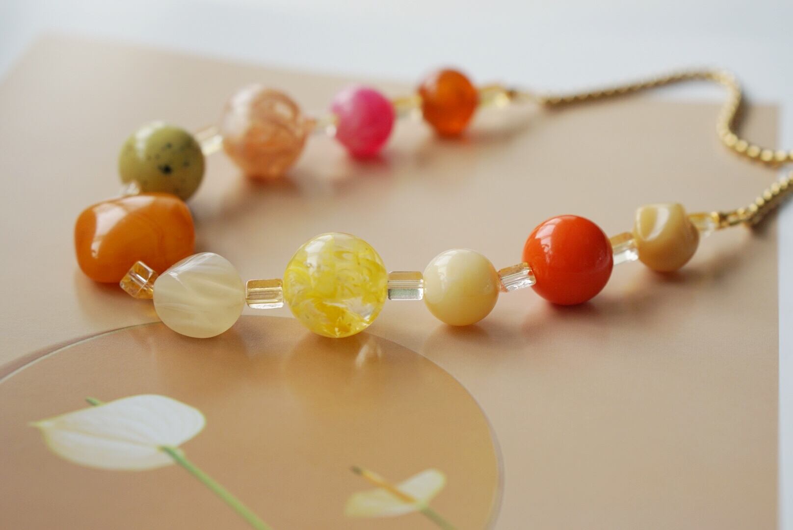 アクリル製のカラフルなビーズをメイン使用した、鮮やかでポップなロングタイプのネックレス。ニットやタートルネックにも合わせやすい長さです。ボリューミーな見た目に反して軽やかな着け心地です。シンプルなスタイルにこれ一本を合わせるだけで個性的なルックが完成。