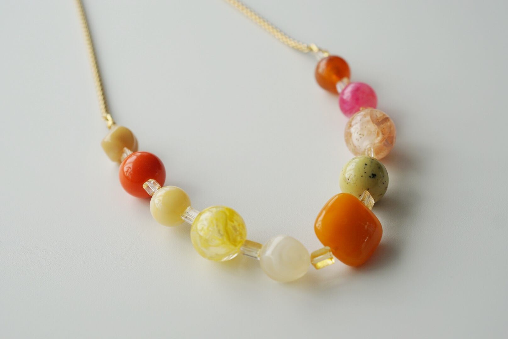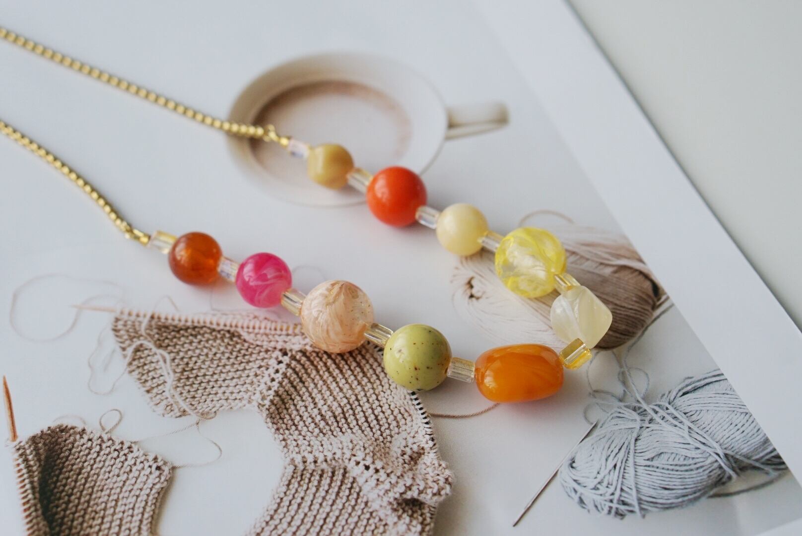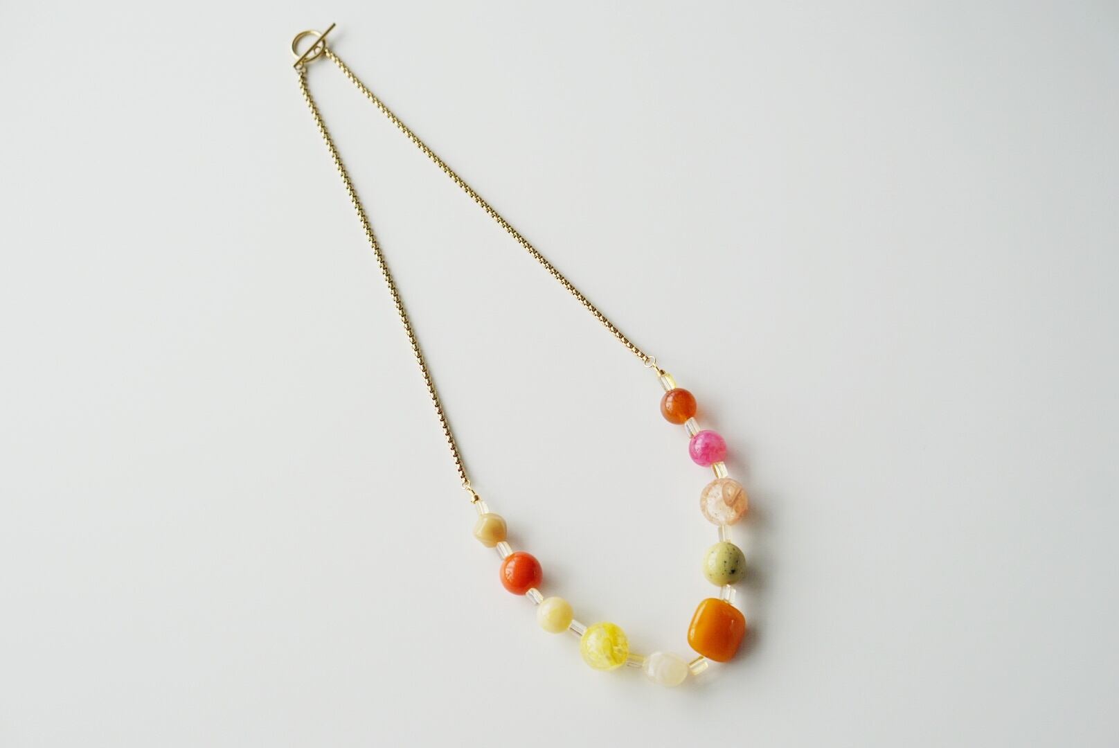 アクリル製のカラフルなビーズをメイン使用した、鮮やかでポップなロングタイプのネックレス。ニットやタートルネックにも合わせやすい長さです。ボリューミーな見た目に反して軽やかな着け心地です。シンプルなスタイルにこれ一本を合わせるだけで個性的なルックが完成。