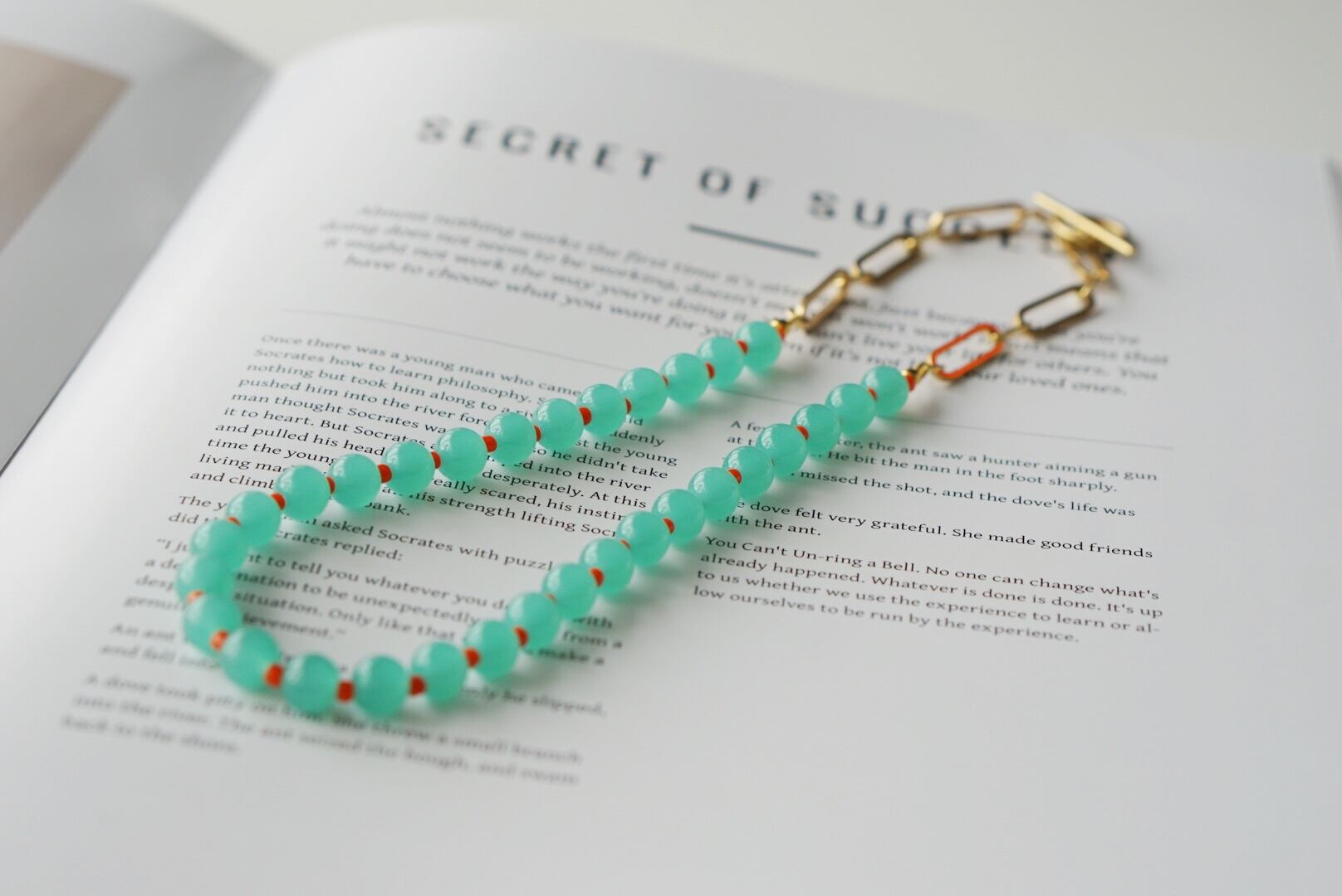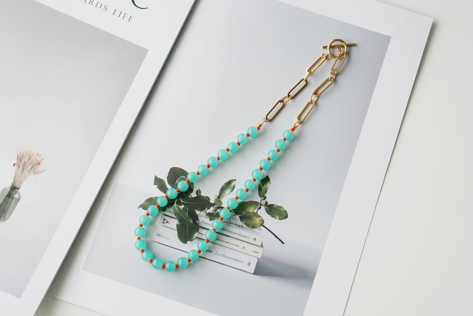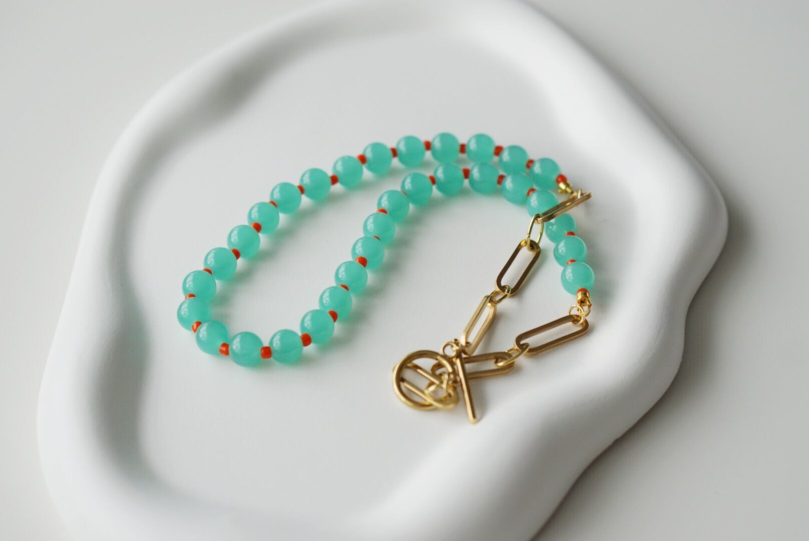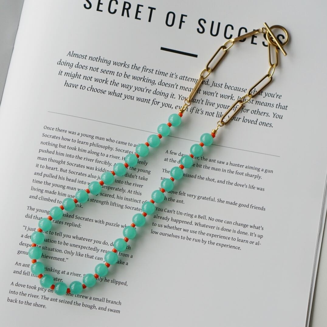 静かな湖の水面のようにブルーグリーンがやわらかくゆらめくネックレス。カラフルなオレンジのビーズが入ることで単調にならず個性的なネックレスに仕上げています。シンプルな造りなのでお好きなネックレスと2、3本重ね付けしてボリューム感を出したりその日の気分でコーディネートするのもおすすめ。